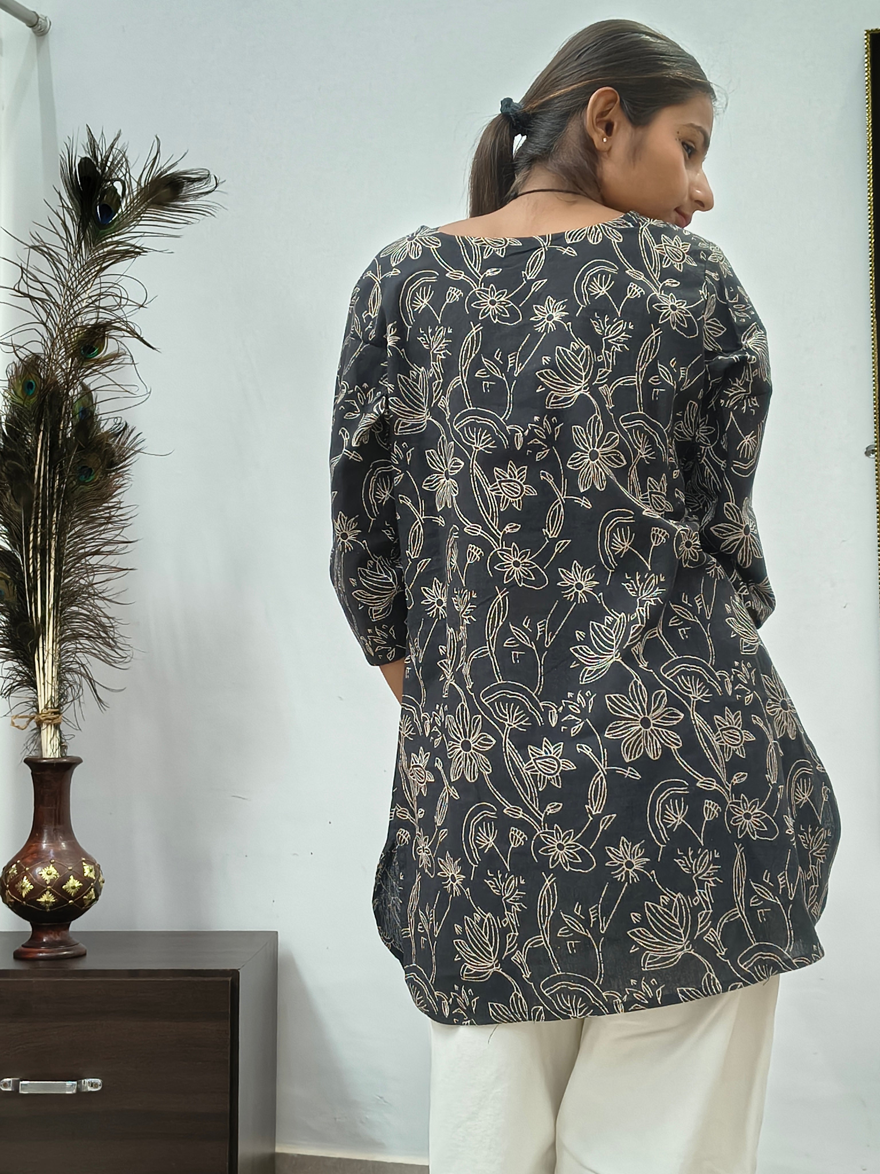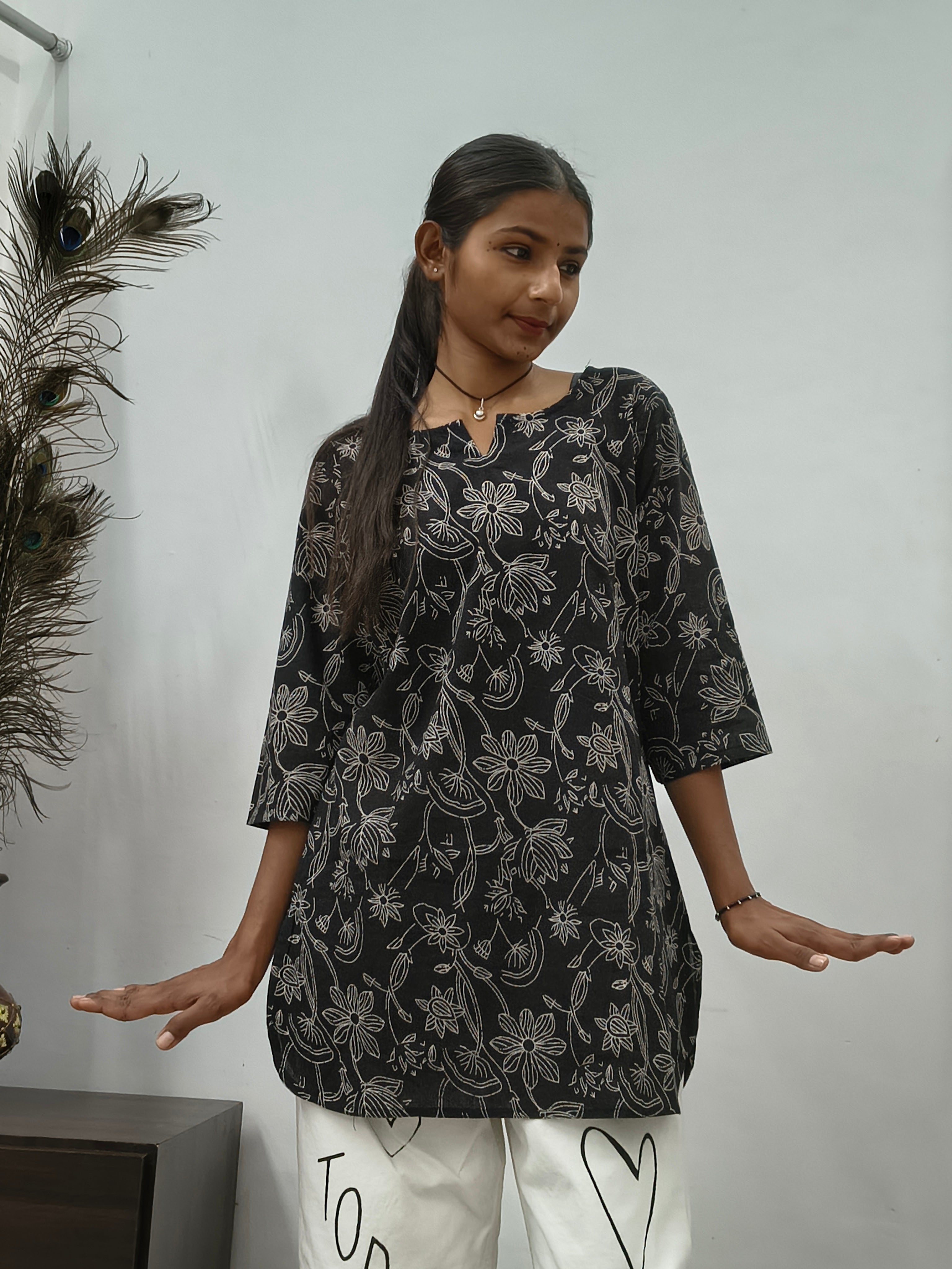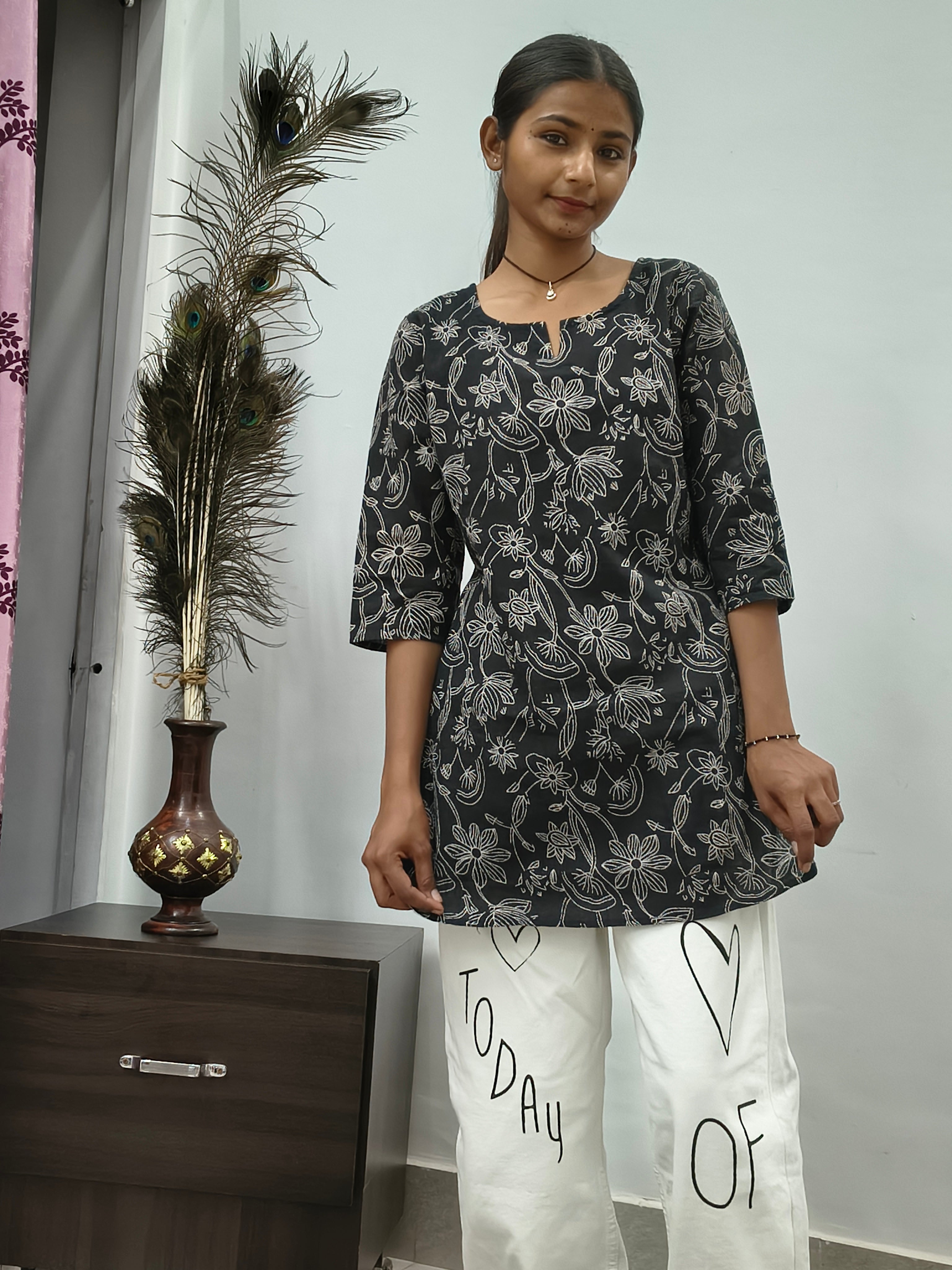 • Model wearing black cotton short kurti with white floral vine print indoors