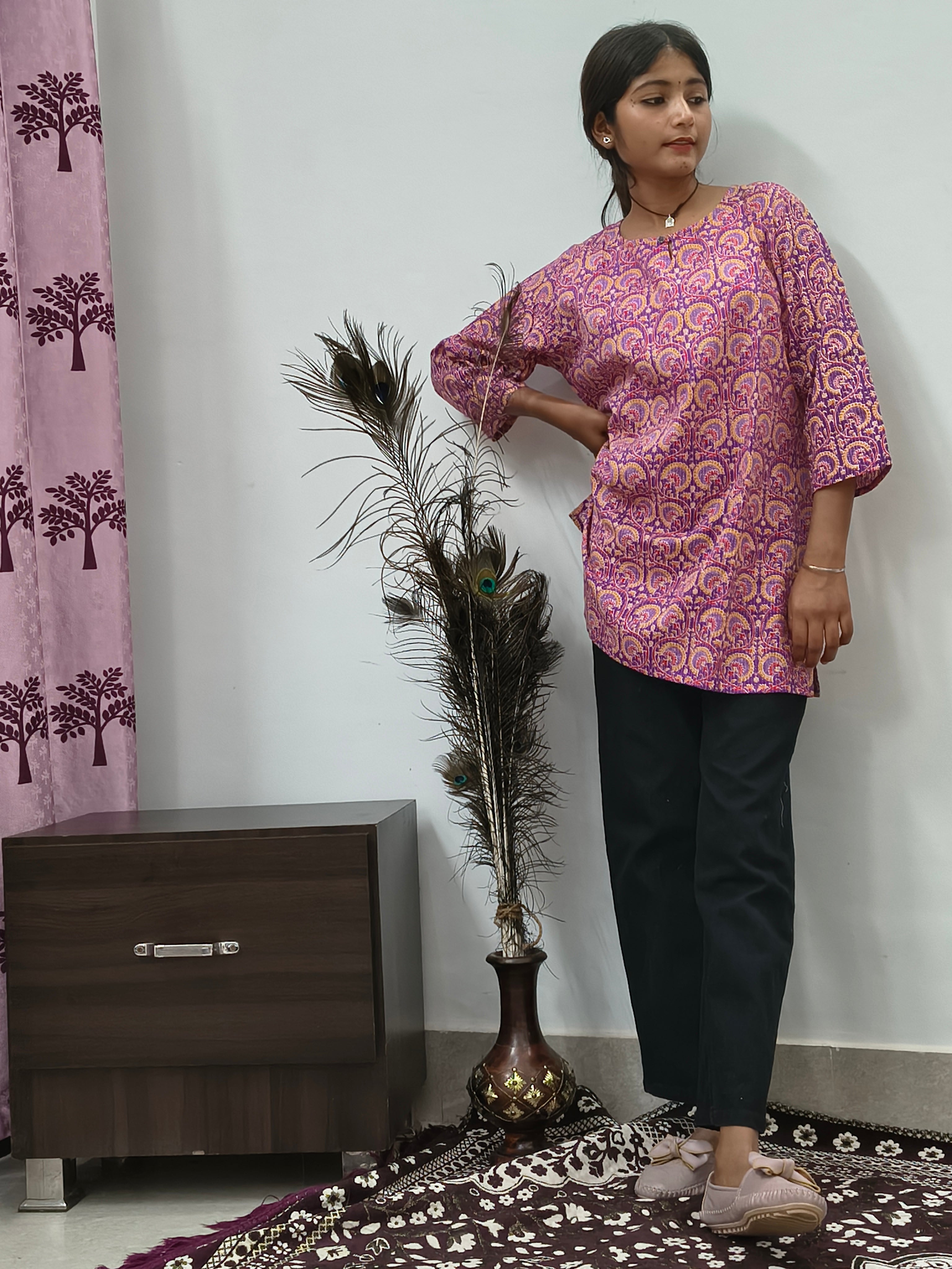 This purple paisley print cotton short kurti is designed for effortless ethnic style and daily comfort. Featuring a vibrant purple base with intricate yellow and pink paisley-inspired motifs, this kurti adds a lively and artistic touch to your wardrobe.